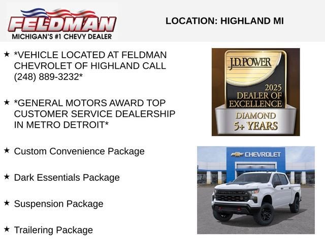 *VEHICLE LOCATED AT FELDMAN CHEVROLET OF HIGHLAND CALL (248) 889-3232*, *GENERAL MOTORS AWARD TOP CUSTOMER SERVICE DEALERSHIP IN METRO DETROIT*, 10-Speed Automatic, 4WD, Jet Black Cloth, 6-Speaker Audio System, Apple CarPlay/Android Auto, Auto High-beam Headlights, Automatic Emergency Braking, Black Name Plates, Brake assist, Chevytec Spray-on Black Bedliner, Custom Convenience Package, Dark Essentials Package, Electric Rear-Window Defogger, EZ Lift Power Lock and Release Tailgate, Forward Collision Alert, HD Rear Vision Camera, Heavy-Duty Air Filter, Hill Descent Control, Hitch Guidance, Integrated Trailer Brake Controller, Lane Keep Assist with Lane Departure Warning, LED Cargo Area Lighting, Performance Red Recovery Hooks, Premium audio system: Chevrolet Infotainment 3, Radio data system, Radio: Chevrolet Infotainment 3 System, Remote Vehicle Starter System, Suspension Package, Theft Deterrent System (unauthorized Entry), Trailering Package, Wheels: 18 x 8.5 Black Painted Aluminum.