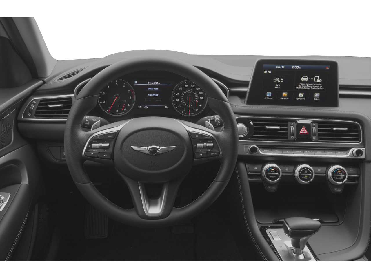 - Radio: AM/FM/SiriusXM/HD Audio System -inc: 6 channel internal amplifier, 6 speakers including subwoofer, 8" display audio, speed-sensing auto volume control, Apple CarPlay and Android Auto, Bluetooth® hands-free phone system, steering wheel audio, cruise and phone controls, 2 USB front: ( front console: data + charge / center console: charge only ), 1 USB rear (charge only), auxiliary input jack and Genesis Connected Services Telematics System